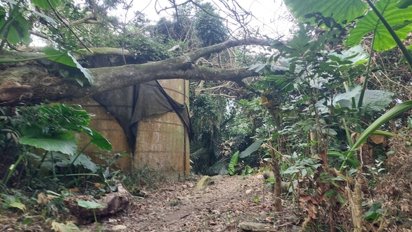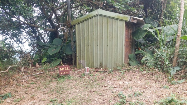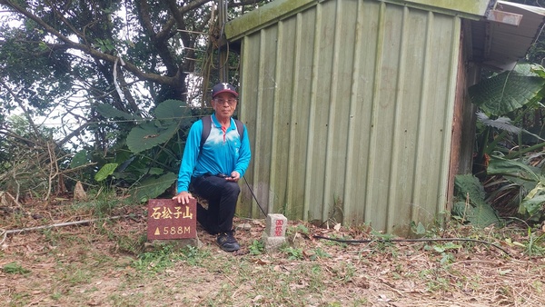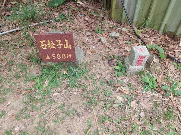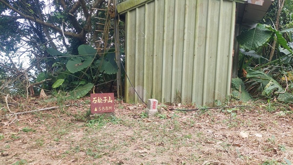 石松子山,標高588公尺,位於台南南化區與高雄內門區交界處,山頂立有一顆土地調查局圖根點,基點旁有一間看似廢棄的機房。