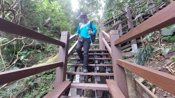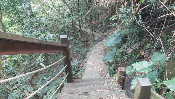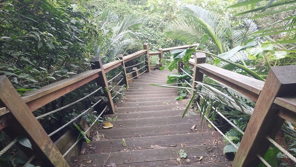 走木棧道往龍湖寺,連續下坡階梯。