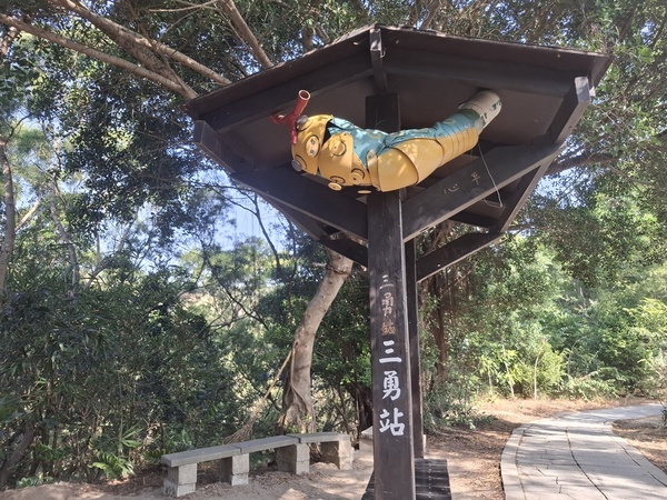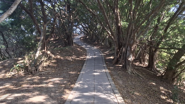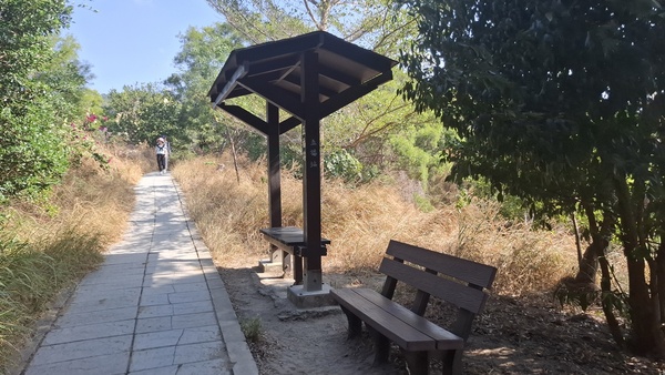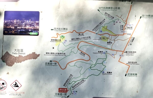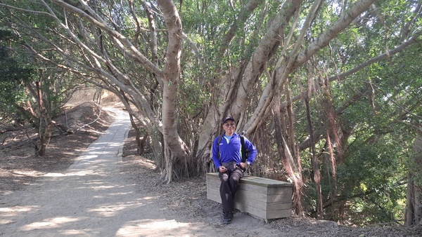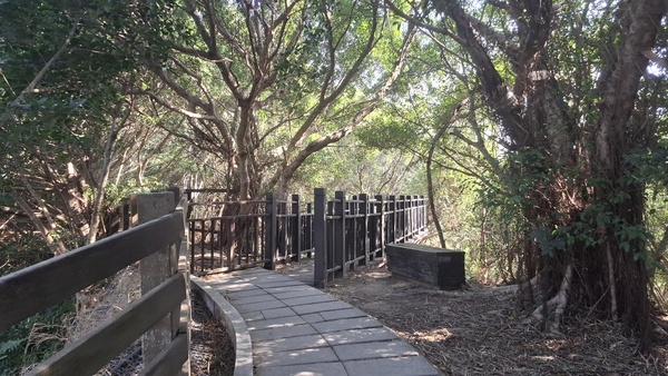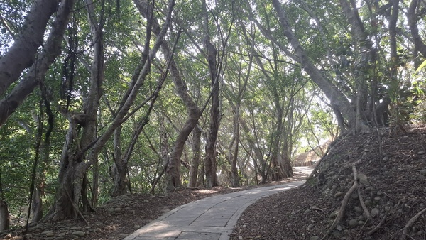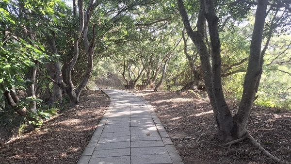聽說大肚車站附近有一個步道叫「萬里長城,」步道蜿蜒於稜線上連綿不絕,因而得名,好走的石板路與土徑,穿梭在保安林裡,綠樹成蔭、鳥語花香,每到夏季相思樹開花季節,黃花錯落於翠綠山巒之間,美麗極了,走到步道的高點「享壽亭」,可以眺望台中港區、火力發電廠、彰化、大肚溪以南的平地,也是欣賞夕陽的最佳地點,路徑是石階、土徑、土石路,安全易行;里程3.5公里,時間約2小時,於是我就出發了。