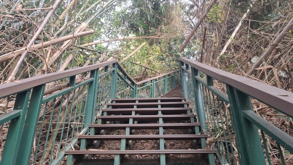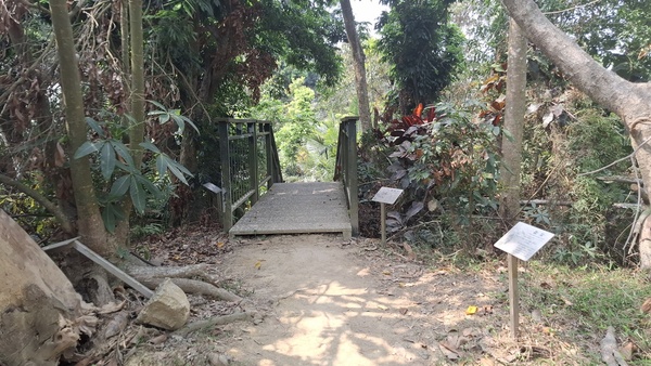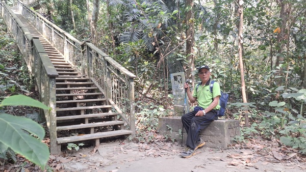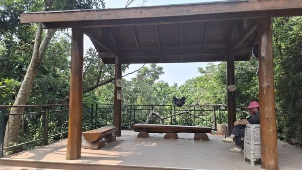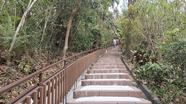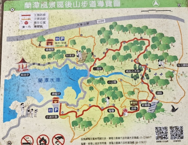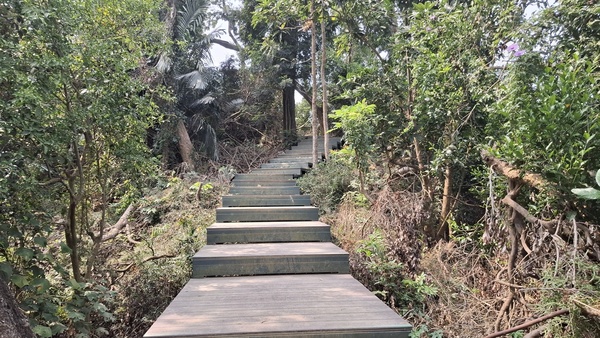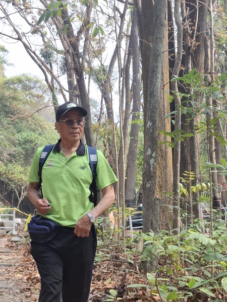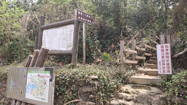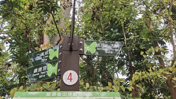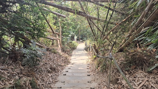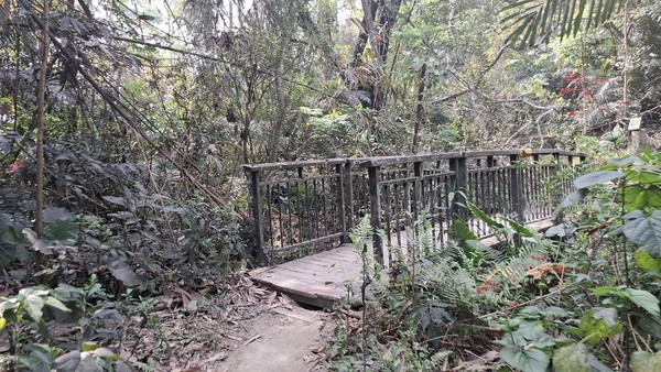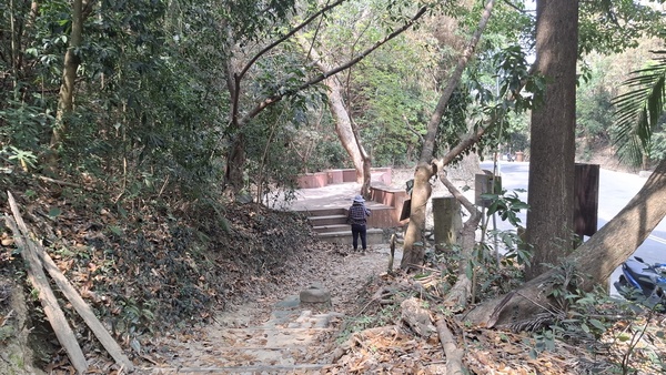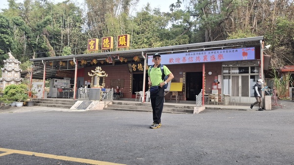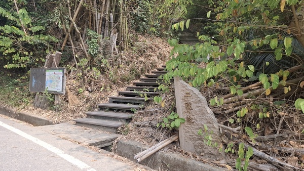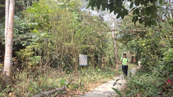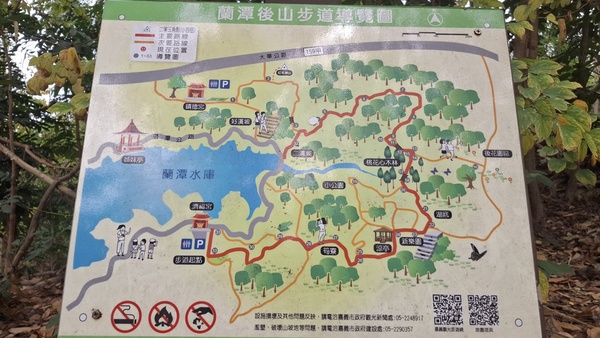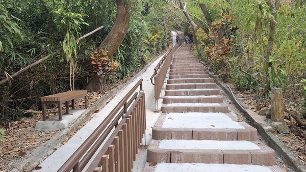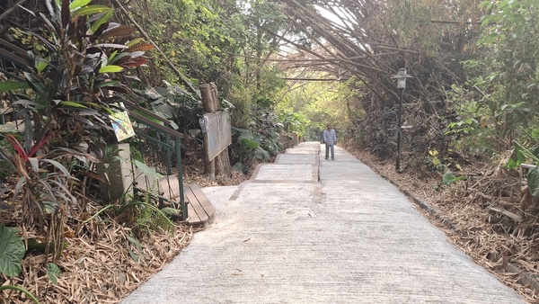 2026.03.24早上我搭07:21的自強號火車北上,中間沒有停任一站,07:56抵達嘉義車站,車站左方就有微笑單車可租用,由於嘉義到蘭潭水庫是上坡路程,我特地選用電動輔助車,在最後一公里多,我故意還車,用走路的方式,一面散步一面欣賞兩側的街景,08:47抵達鎮德宮,它是一間主祀玄天上帝(俗稱上帝公)的廟宇,在廟內參拜一下,08:55出發往後山步道,入口處有一叢很大的竹林,一分鐘後有叉路,直行是山徑,左上是急陡階梯往「山仔頂山」,我選左上階梯,08:59抵達山仔頂山,海拔140公尺,有一顆三等三角點,編號是三0五號,接著往下走,找了一陣子09:18才找到紅毛埤山,海拔150公尺,有一顆二等三角點編號1096號,也是小百岳第62號, 09:25進入水泥階梯,09:27通過小木橋,09:30有「里程2K十400」的標誌,路面上有木棧道,09:32往桃花心木林940公尺,09:35通過大板根樹,09:56往桃花心木林453公尺,10:01有一顆「都界」水泥樁,10:13右側小橋被擋住,改走新路線, 10:17高聳的階梯出現,連續好幾座上坡階梯,10;24很大的休息涼亭,10:26里程是「0k+850」,10:29筍寮山 ,10:47環潭公路,費時兩小時,在木板椅上休息一段時間後走環潭公路回鎮德宮,11:03二漢坡,11:05好漢坡,水泥階梯往鎮德宮,11:15回到鎮德宮,全程2小時28分鐘。