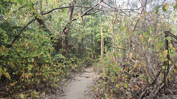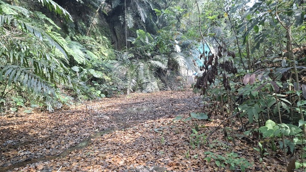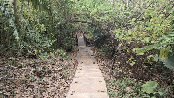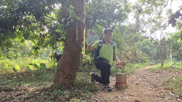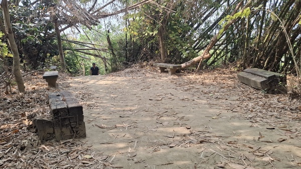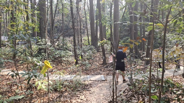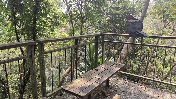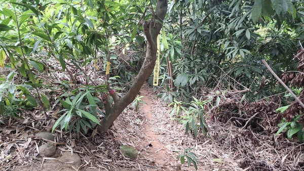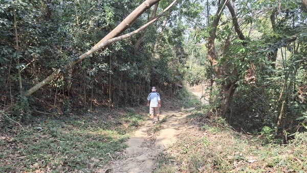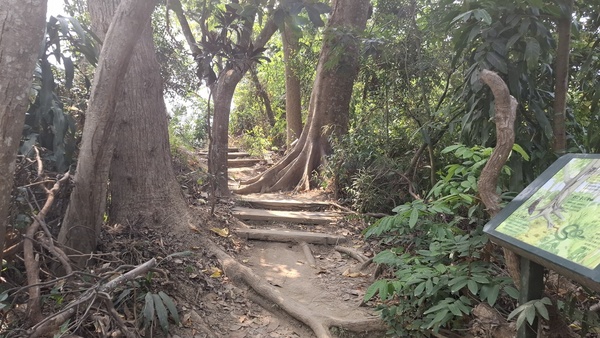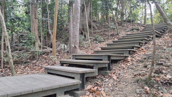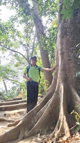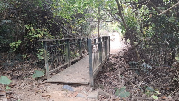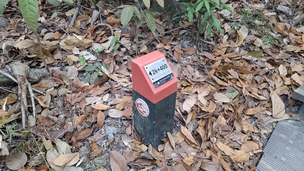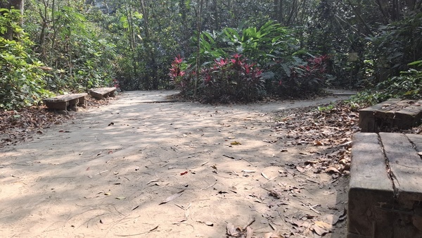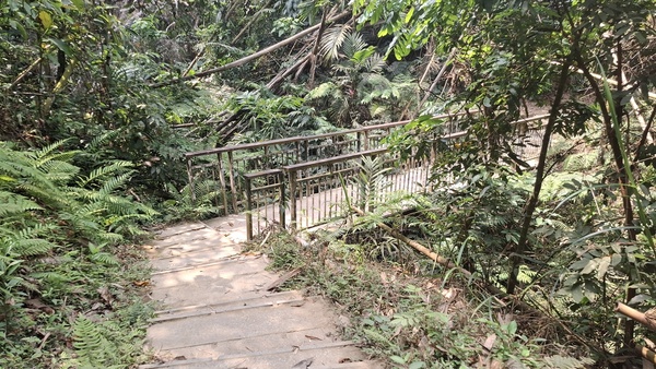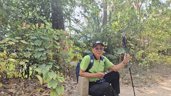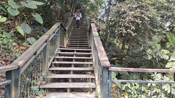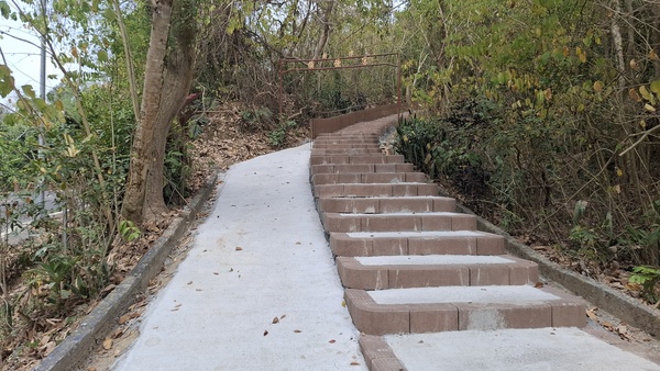 2026.03.24早上我搭07:21的自強號火車北上,中間沒有停任一站,07:56抵達嘉義車站,車站左方就有微笑單車可租用,由於嘉義到蘭潭水庫是上坡路程,我特地選用電動輔助車,在最後一公里多,我故意還車,用走路的方式,一面散步一面欣賞兩側的街景,08:47抵達鎮德宮,它是一間主祀玄天上帝(俗稱上帝公)的廟宇,在廟內參拜一下,08:55出發往後山步道,入口處有一叢很大的竹林,一分鐘後有叉路,直行是山徑,左上是急陡階梯往「山仔頂山」,我選左上階梯,08:59抵達山仔頂山,海拔140公尺,有一顆三等三角點,編號是三0五號,接著往下走,找了一陣子09:18才找到紅毛埤山,海拔150公尺,有一顆二等三角點編號1096號,也是小百岳第62號, 09:25進入水泥階梯,09:27通過小木橋,09:30有「里程2K十400」的標誌,路面上有木棧道,09:32往桃花心木林940公尺,09:35通過大板根樹,09:56往桃花心木林453公尺,10:01有一顆「都界」水泥樁,10:13右側小橋被擋住,改走新路線, 10:17高聳的階梯出現,連續好幾座上坡階梯,10;24很大的休息涼亭,10:26里程是「0k+850」,10:29筍寮山 ,10:47環潭公路,費時兩小時,在木板椅上休息一段時間後走環潭公路回鎮德宮,11:03二漢坡,11:05好漢坡,水泥階梯往鎮德宮,11:15回到鎮德宮,全程2小時28分鐘。