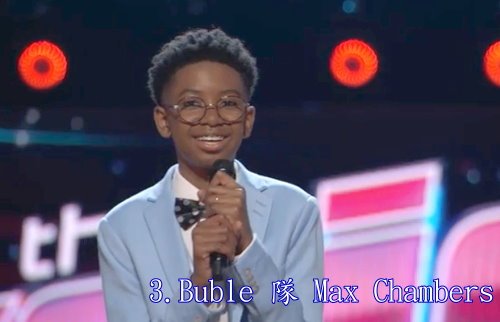 3. Buble 隊 Max Chambers – I Want You Back,14歲,來自路易斯安那州,他的聲音跟年輕的 Michael Jackson 神似,還沒有變聲,完全不怯場,很自然的又唱又跳,Michael 先按鈕,Reba 加入,他選 Buble 隊。