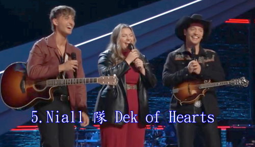 5. * Niall 隊 Dek of Hearts – Heads Carolina, Tails California,三重唱,Dek 是 Dylan/Emily/Kollin 三位的名字,目前居住在納許維爾,典型的鄉村風,男聲低沉,女聲寬潤有畫龍點睛的效果,Reba 先按鈕,Niall 其次,Snoop 加入,Michael 也轉身,4椅轉身,看來 Reba 粉聲勢驚人,沒想到他們選 Niall 隊。