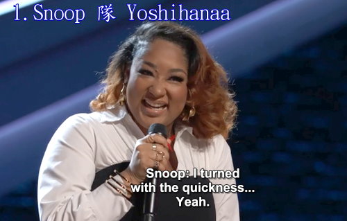 1. Snoop 隊 Yoshihanaa – Nobody’s Supposed to Be Here,36歲,來自佛羅里達州,現在居住在喬治亞州,爵士風,key 高,她的聲音很寬,共鳴很好,Snoop 率先按鈕,Reba 和 Niall 也同時轉身,她選 Snoop 隊。