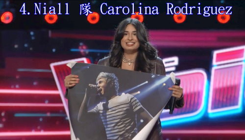 4. Niall 隊 Carolina Rodriguez – Cardigan,19歲,來自佛羅里達州,她是 Niall 的粉絲,聲音很稚嫩清脆,臨場經驗不足,Niall 先按鈕,Snoop 也轉身,她還帶著一張2011年 Niall 的海報,Niall 幫她簽名,她當然選 Niall 隊。