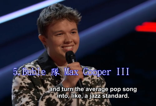 5. * Buble 隊 Max Cooper III - Cooler Than Me,23歲,來自堪薩斯州,自彈自唱,他的 key 不高,聲音柔蘊含情感,像在說故事,Snoop 率先按鈕,隔一陣,Reba 也轉身,Niall 和 Michael 都加入,4椅轉身,他表演的第1首歌,正好是 Michael 寫的, Michael 當場要求一起合唱,那…就很明顯,他選Buble 隊。