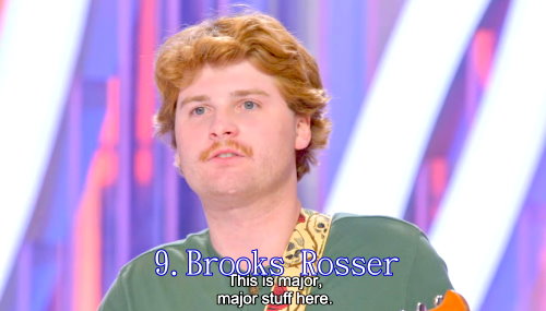 9. Brooks Rosser – Your Place at My Place,22歲,來自馬里蘭州,很害羞緊張,他的工作是照顧失智者,自彈自唱,他的聲音尖細像女聲,拿到金色通行證。*** 進入前20