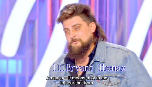 11. Bryant Thomas – Against All Odds,26歲,來自阿拉巴馬州,他先躲在柱子後面唱,沒人看見他的面孔,他的聲音帶著感情,老練,有著鄉村歌手的豪情,拿到金色通行證,他在現場向女友求婚。** 進入前30