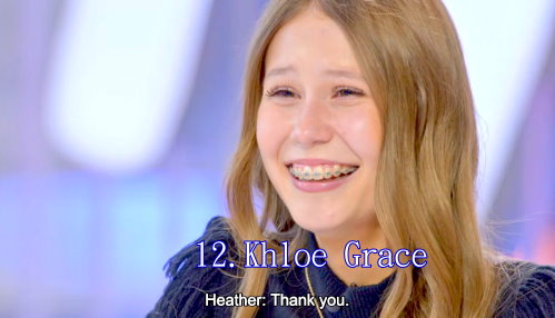12. Khloe Grace – Forever 13 (原創),15歲,來自佛羅里達州,她寫一首歌獻給另一位13歲因霸凌自殺的女孩,她從沒見過對方家人,她就表演這首歌,她的聲音嫩,甜美且很有力道,整首個像是一個故事,歌詞很長,評審聽得很感動,Carrie 快落淚,拿到金色通行證。