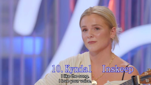 10. Kyndal Inskeep – Honest (原創),29歲,來自印第安納州,自彈自唱,她的聲音有點細薄,要很細的聽才聽得出她的音色,整場閉眼表演,拿到金色通行證。*** 進入前20