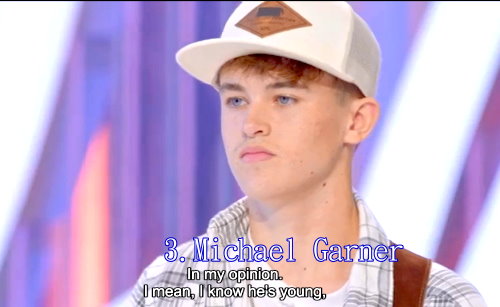 3. Michael Garner – I’m Still Fine,16歲,來自阿肯色州,他的聲音偏低還不到沉的程度,帶有年輕的韻味,比他的年齡成熟,拿到金色通行證。** 進入前30