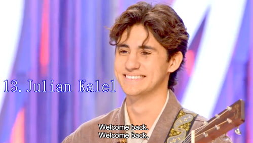 13. Julian Kalel – Lone Guitar (原創),19歲,來自德州,前一季曾經參加試唱,沒準備好,他的聲音成熟且帶絲沙啞,自彈自唱,今年的聲音更成熟更穩,Carrie 聽得要掉眼淚,拿到金色通行證。*** 進入前20
