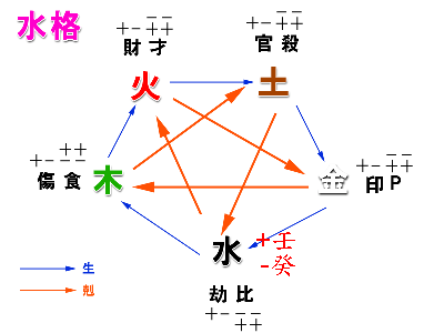 人的出生年月日時,可得出四組干支,然後生日這天的天干,就是這個人的五行,每一種五行分陰陽兩個,水也有陰陽,壬為陽,而癸屬陰。由此表格對照可以得到,天干有庚,就有正印這顆星。天干有丙,就有正財這顆星。