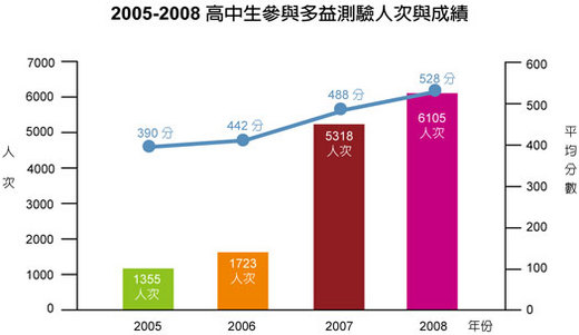 以 TOEIC 多益測驗為例,根據ETS台灣區代表忠欣公司表示,其高中生報考人數從 2003 年的 181 名,一路躍升至 2009 年的 18,000 人次,目前仍在急速增加中;而平均成績也從2005 年的 390 分,攀升到 2008 年的 528 分,與同年度的大學生平均成績 529 分相較起來,相去不遠。除了顯示出高中生的英文能力大幅提升外,也顯示出學生們想要透過英檢證照,在大學甄選時脫穎而出的想法與企圖心,已經越來越強烈了。因此,英檢證照儼然已成為高中生必備證照。