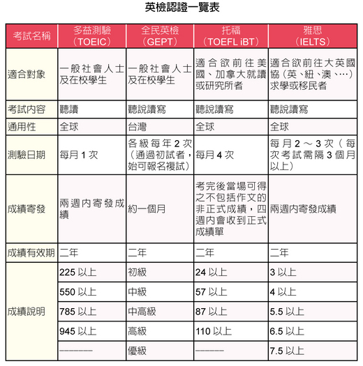 在諸多英語能力檢定機制之中,多數人會選擇的主流英檢一般來說有以下四種:TOEIC(多益)、TOEFL iBT(托福)、IELTS(雅思)、全民英檢(GPET)。參與大學甄選的學生們,可根據各校院各類組的需求,選擇最適證照。在此簡單地介紹一下這四類英檢。
