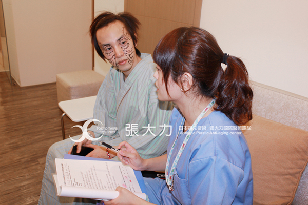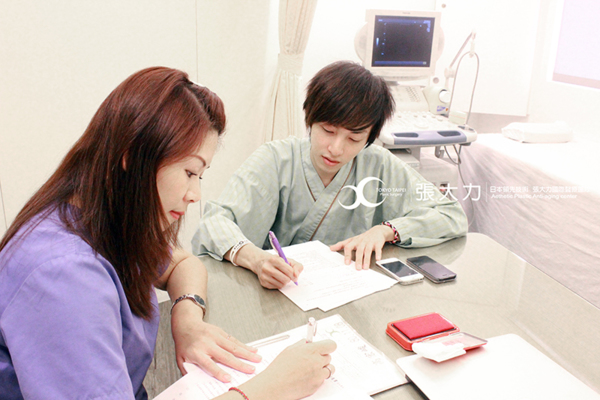 G先生在隱密診間填寫資料,諮詢師會給予整形療程初步建議。