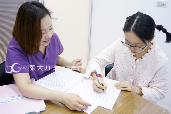 專業護理師親切地告訴W小姐隆乳的須知,在隱密的諮詢室一對一諮詢與醫師問診,非常安心。