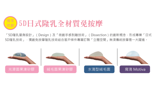 了解所有材質後,發現平滑面最適合自己所想要的觸感及外型,但要「按摩」這個對QQ來說就是一大困擾了,沒想到「5D隆乳手術」,使用立體剝離技術,打造3D立體空間,在手術中使用內視鏡在各個角度精雕細琢,塑造一個立體空間來放置乳袋,這樣就不需要按摩了,不但節省非常多的時間還更加自然。