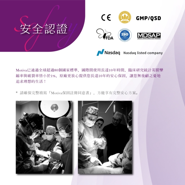 波力媚Motiva魔滴隆乳術後五年內,如果發生貝克氏等級三到四級的莢膜攣縮,原廠除了提供您新的乳房植入物替代品,還會提供您一筆重建的手術費用。