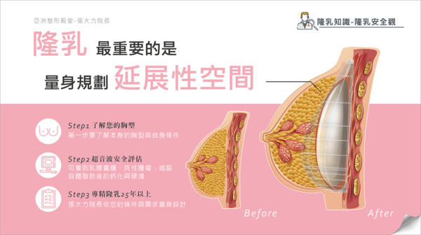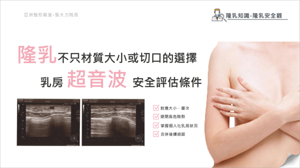 隆乳權威張大力院長說明:「每種隆乳方式都有適合的族群,成功穩定的隆乳手術不只有材質大小或切口的選擇,乳房超音波的優勢在分析乳房組織分布與狀態、脂肪組織比例、乳腺基質條件等全面評估安全隆乳方式。」