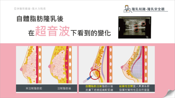 隆乳後乳房外觀要自然垂墜、觸感柔軟,除了醫師的美感更重要的是規劃足夠的隆乳空間,自體脂肪隆乳無法靠注射脂肪打造立體空間,張大力院長特別提醒:「平胸者、有纖維囊腫、過瘦或有高危險群及家族史及乳癌病史者不適合施打。」在超音波檢測下看到自體脂肪隆乳後的變化通常層次凌亂,且有節結、疤痕與囊腫等分布。乳房的血管密度不如臉部的細又多,血管少循環差,發炎與疤痕的反應皆會影響乳房自然垂墜感。