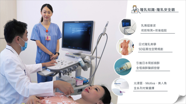 日式隆乳一站式服務提供受術者的本身條件與對應術式說明,從術前注重乳房超音波檢查可提升隆乳手術的安全性、術中分級高規無菌消毒觀念、內視鏡隆乳技術(延展性空間)、引進日本流行局部麻醉(免去全身麻醉的風險)、術後定期超音波健檢追蹤等醫療全流程隆乳安全規劃。