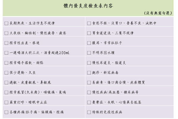 圖說:【發炎度檢查表】若勾選1-5項,處於小發炎,介於健康與亞健康之間;6-10項,須注意,有慢性發炎風險;10項以上,建議調整目前生活飲食方式。