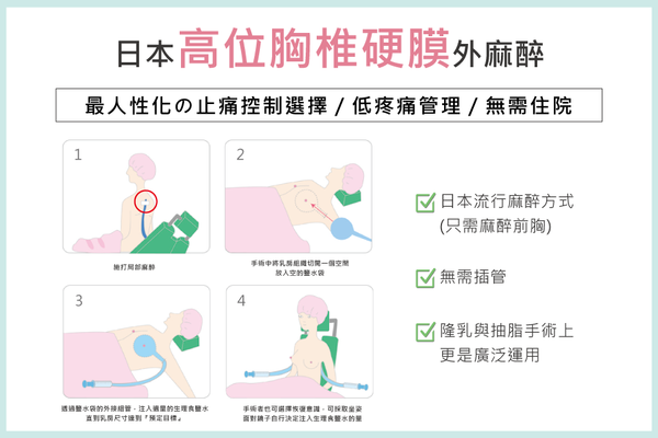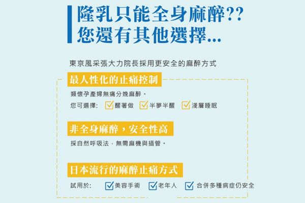 東京風采診所的隆乳手術麻醉,施打的是類似生產無痛分娩的局部麻醉,源自日本乳房整形的做法,麻醉醫師打完麻醉後同時施以舒眠鎮靜,減少鎮靜的深度,大大降低手術風險,麻醉醫師會全程監控、調整直到手術結束,確保貴賓生理各項指標穩定甦醒後,才會離開,因為使用的是局部麻醉,風險較低。有些診所隆乳手術選擇全身麻醉,需要插管等,只要有麻醉專科醫師全程陪伴,也有一定的安全保障。