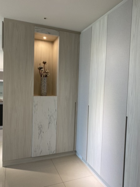 玄關處使用不同板材的色彩搭配,使視覺增添一層豐富性,在端景上闢出一格框擺設,