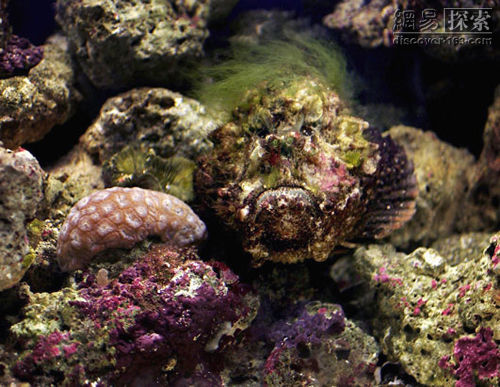 你 可能不能從此圖片將石頭魚挑選出來。它貌不驚人,身長只有30釐米左右的石頭魚,就躲在海底或岩礁下,將自己偽裝成一塊不起眼的石頭,即使你站在它的身 旁,它也一動不動,讓你發現不了。如果不留意踩著了它,它就會毫不客氣地立刻反擊,向外發射出致命劇毒。它的脊背上那 12~14根像針一樣銳利的背刺會輕而易舉地穿透你的鞋底刺入腳掌,使你很快中毒,並一直處於劇烈的疼痛中,直到死亡。它之所以取名石頭魚是因為它是最劇 毒的水下物種之一。