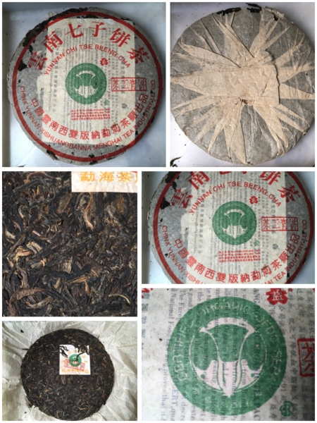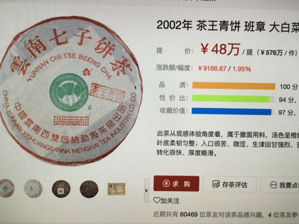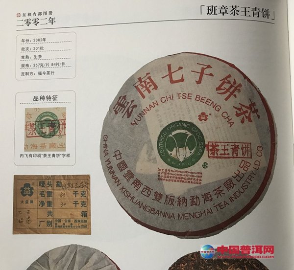 茶王青饼是福今茶业始于2002年在勐海茶厂定制的357克班章青饼,在茶饼外包装上盖有“茶王青饼”印章,每筒7饼用竹壳包装,每件12筒,竹萝装。勐海茶厂生态乔木班章大白菜系列,在同年份的众多大益茶品中实属难得的高档普洱茶,而茶王青饼就是一款高级班章青饼。经过十年的转化,该品条索粗壮紧结,汤色红浓,茶气强劲,典型的班章风格,舌下生津,由于当年生产的数量不多,加上多年来的消费品饮,以及藏家的惜售心理,目前市场上己难觅其高贵身影,而且价格奇高。