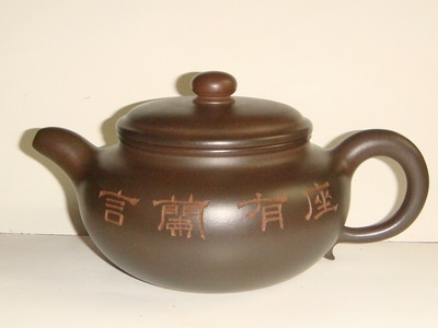 仿古纪念壶,实际做了110把,交给银行100把。壶的制作由顾景舟与沈孝鹿搭档完成,沈做顾景舟的下手;壶上的铭文由吴同构书写、诸葛勋陶刻,一面刻隶书“座有兰言”,另一面刻“全国省银行第六次座谈会纪念,江苏省农民银行,江苏省银行敬贺”。
