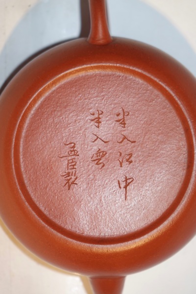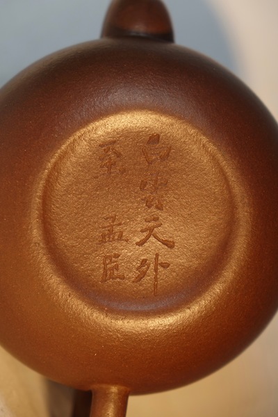 孟臣壶传器款识有书“文杏馆孟臣制”、“荆溪惠孟臣制”、“惠孟臣制”、“孟臣制”。有的前面标有制作年份或绝句,如“大明天启丁卯孟臣制”、“水浸一天星孟臣”、“叶硬经霜绿孟臣制”、“烟村四五家孟臣”或“云入西津一片明”、“寸心千古秀”等诗句,一般是在十几字组成的诗句或吉祥语闲章下镌刻孟臣制,字体多为楷书,也有行书体,笔势灵动,具书法韵味,用竹刀刻划,后期作品并用钤印。孟臣壶的款识以盖内有“永林”篆书小印者为最佳精品。
