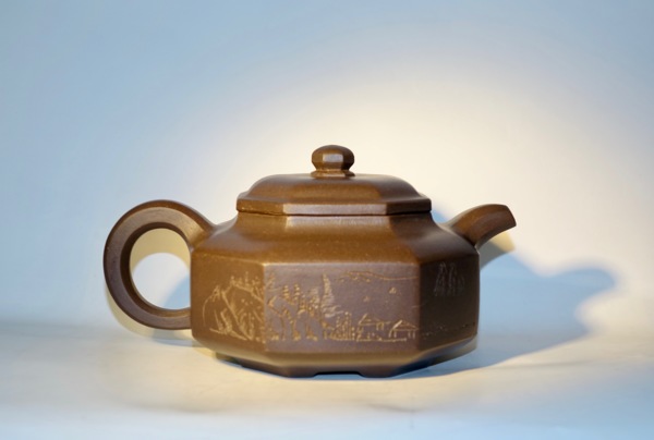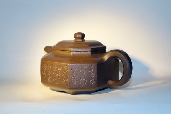 說明:此件壺品為矮八方紫砂壺,該壺器形非常簡練,但不失恢弘之勢,表面光潤,沒有半點裝飾,稜角分明筆直,顯得十分莊重大方,質地溫潤細膩,握在手中柔和舒適。此壺整體清雅大方,端莊秀麗,盡顯大師風範,是紫砂壺中的珍品。