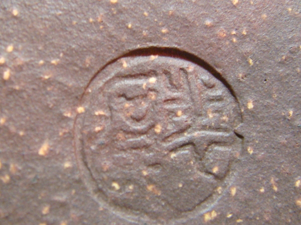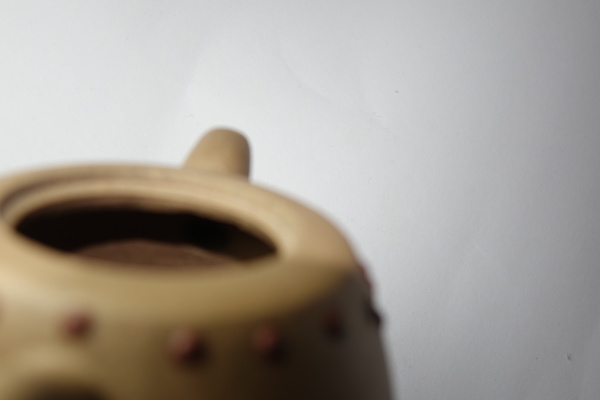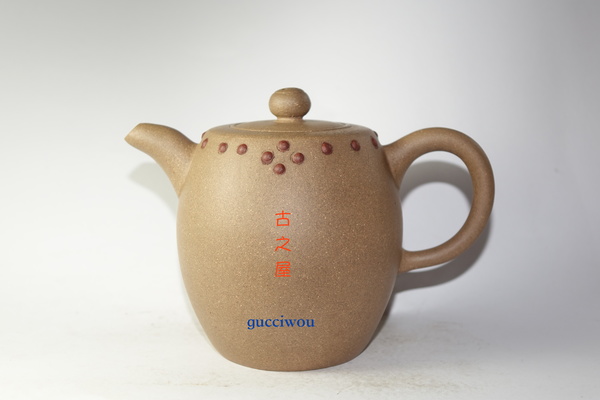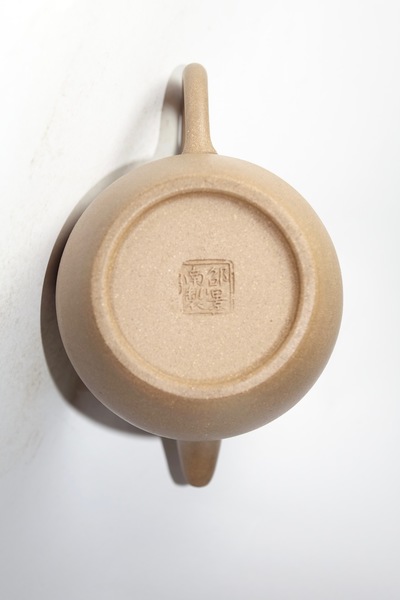 此壶砂色沉穆,包浆内蕴。形制仿民间乐器大鼓,饰两圈鼓钉,嵌盖,钮面刻太极阴阳双鱼,巧妙地使气孔与纹饰浑然一体。一弯嘴,圈把上平下圆,暗接与壶身协调字体清峻劲拨,如金刀切玉,神采逼人。底钤:『邵景南制』四字阳文楷书方印。