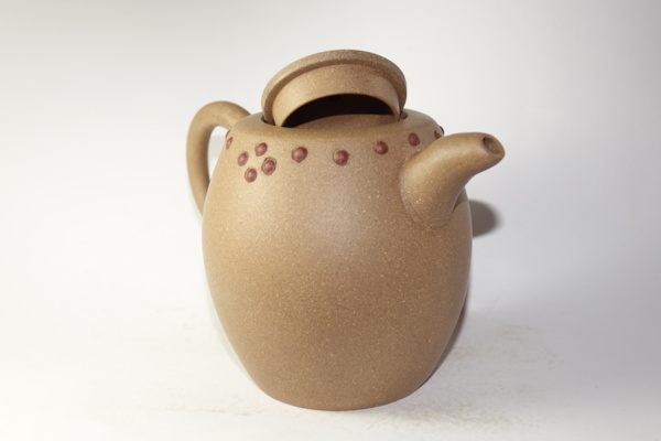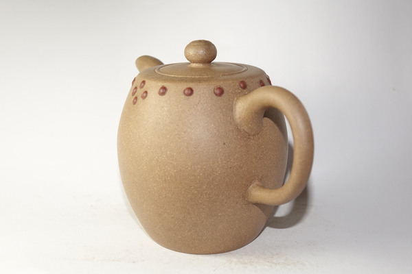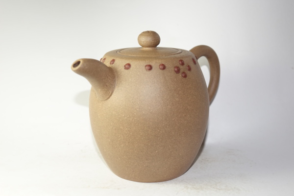 在我国的民俗文化中,太极鼓是一种典型的民俗表演。其中间的指挥鼓代表太极。暗示万物之源,八个方位上的八面大鼓即为八卦。在这里,古老的传说、灵动的韵律和传统的年俗创新交融在一起,演绎了宇宙从无到有、万物生化的伟大进程,表达人们祈求平安吉祥、风调雨顺的美好愿望。“太极鼓壶”的结构反映了易学哲理,壶钮上微微凸起八卦太极图喻意“易有太极,是生两仪,两仪生四象,四象生八卦”,万物生生不息。壶身上端堆雕一周乳钉纹,壶腹成鼓状,一弯嘴,圈把上平下圆,暗接与壶身协调。