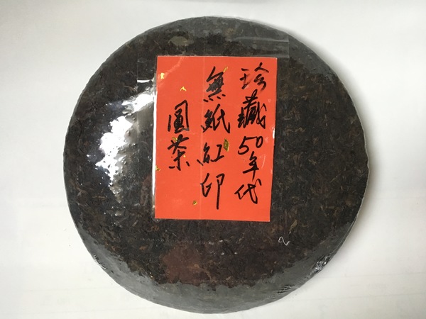 無紙紅印和一般紅印圓茶,只差在有無外包裝紙(無紙紅印也有內飛)。沒有包裝紙,外觀辨識度較差,且保存狀況也會稍受影響,因此無紙紅印售價一直只有有紙紅印一半,但其實內容是一樣的。有紙無紙紅印,一樣是50年代製作,因此至今陳化也有60年歷史,散發出的陳韻一樣迷人,若是想喝道地的50年紅印,也可挑選較便宜的無紙紅印。