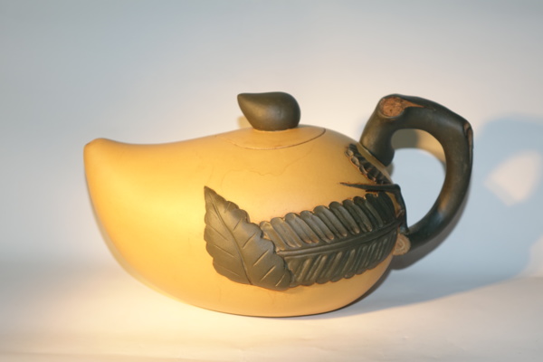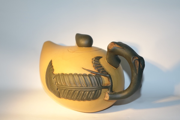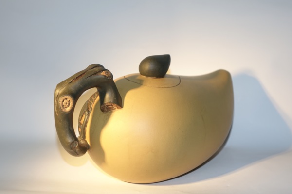此壶是高级工艺美术师蒋蓉一九九零年制作完成。壶身以芒果为形,以果树枝干巧妙为壶柄,壶侧面彩绘浮雕果叶纹饰,浑然一体。栩栩如生。蔣蓉大師文思敏捷,才華出眾,從藝70多年,把畢生的精力都貢獻給了紫砂事業。 在蔣蓉大師70餘年的紫砂藝術生涯中,其在繼承傳統的基礎上藝術創新方面的成就尤為顯著。 從市場看,蔣蓉大師的作品芒果壺在上世紀90年代中期就創下了不俗的成交紀錄。