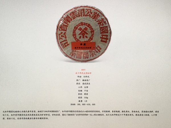 無論紅印茶係是始於佛海茶廠時代或勐海茶廠時代,均是十分具有代表性的產品,且年份亦有可能早於50 年代,但不論如何,兩種說法相差的年份並不大,並不會改變紅印圓茶系的市場地位,畢竟老茶除了包裝辨識外,尚可由品飲中清楚的體認,如此品質驚人與茶韻豐富的紅印茶系產品,有今日的高價,絕非僥倖,同時亦反映了供需的不平衡及市場的高認同度。