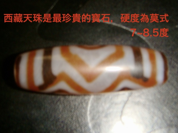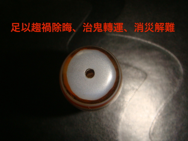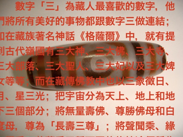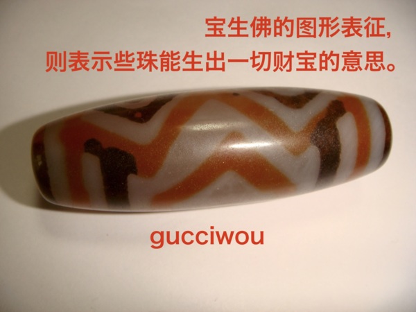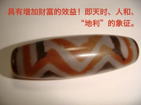是藏族的財神天珠。是佛之身口意功德加持的緣起顯現與三寶加護、速除外內密一切違緣障礙,可以獲得福、祿、壽的吉祥能量補充,代表吉星高照、障礙平息、財富不斷。是一顆能圓滿健康與財富的天珠。