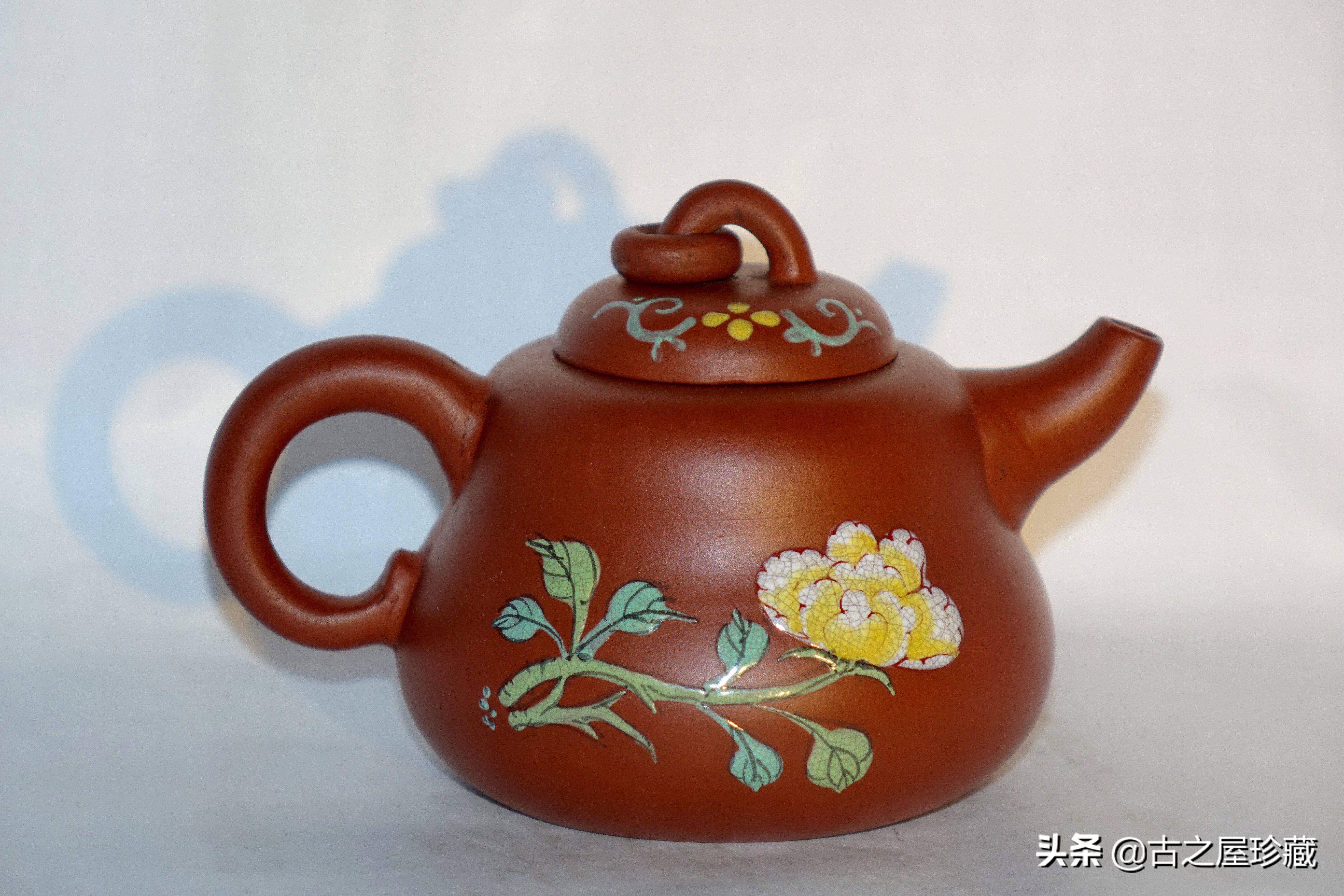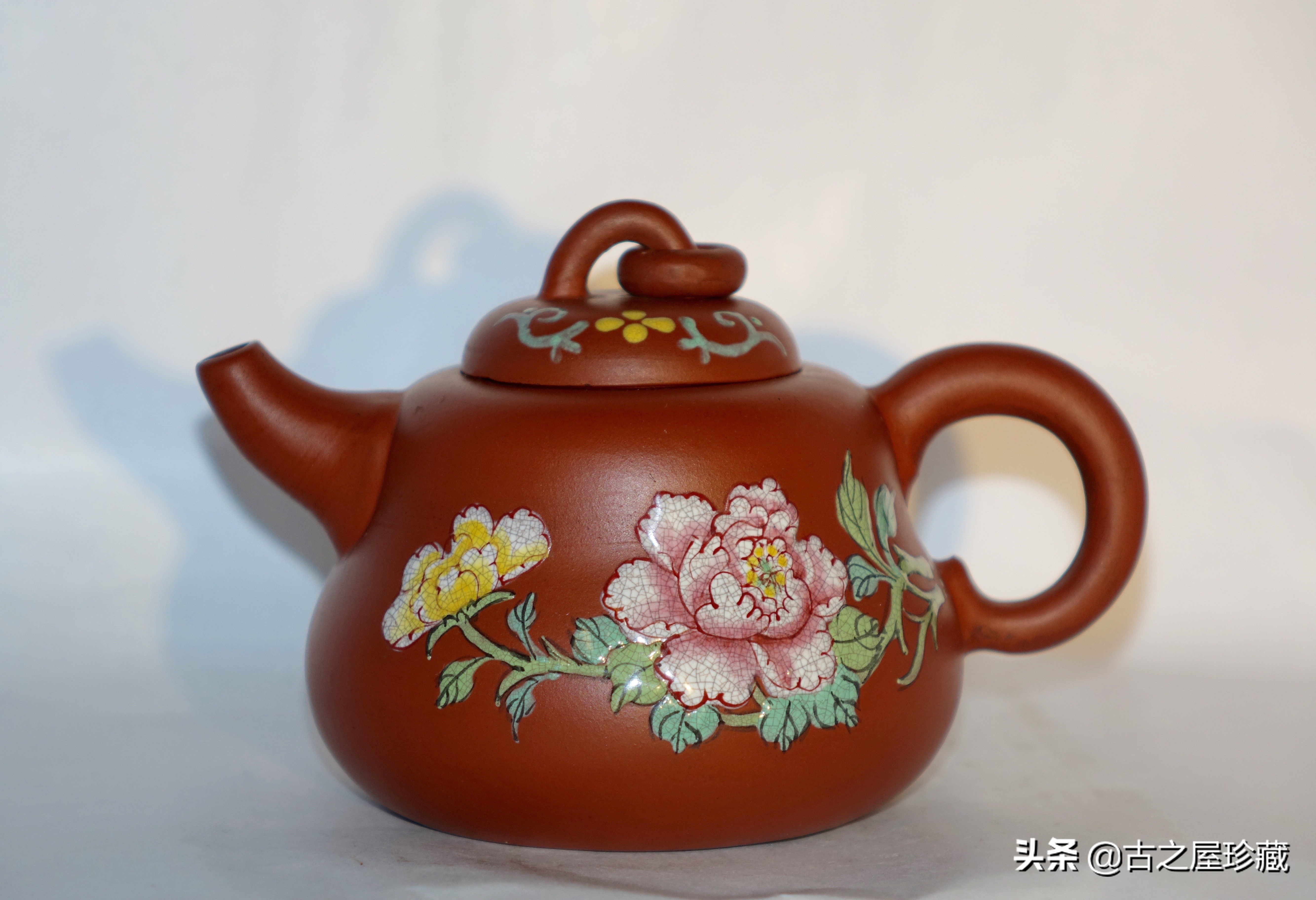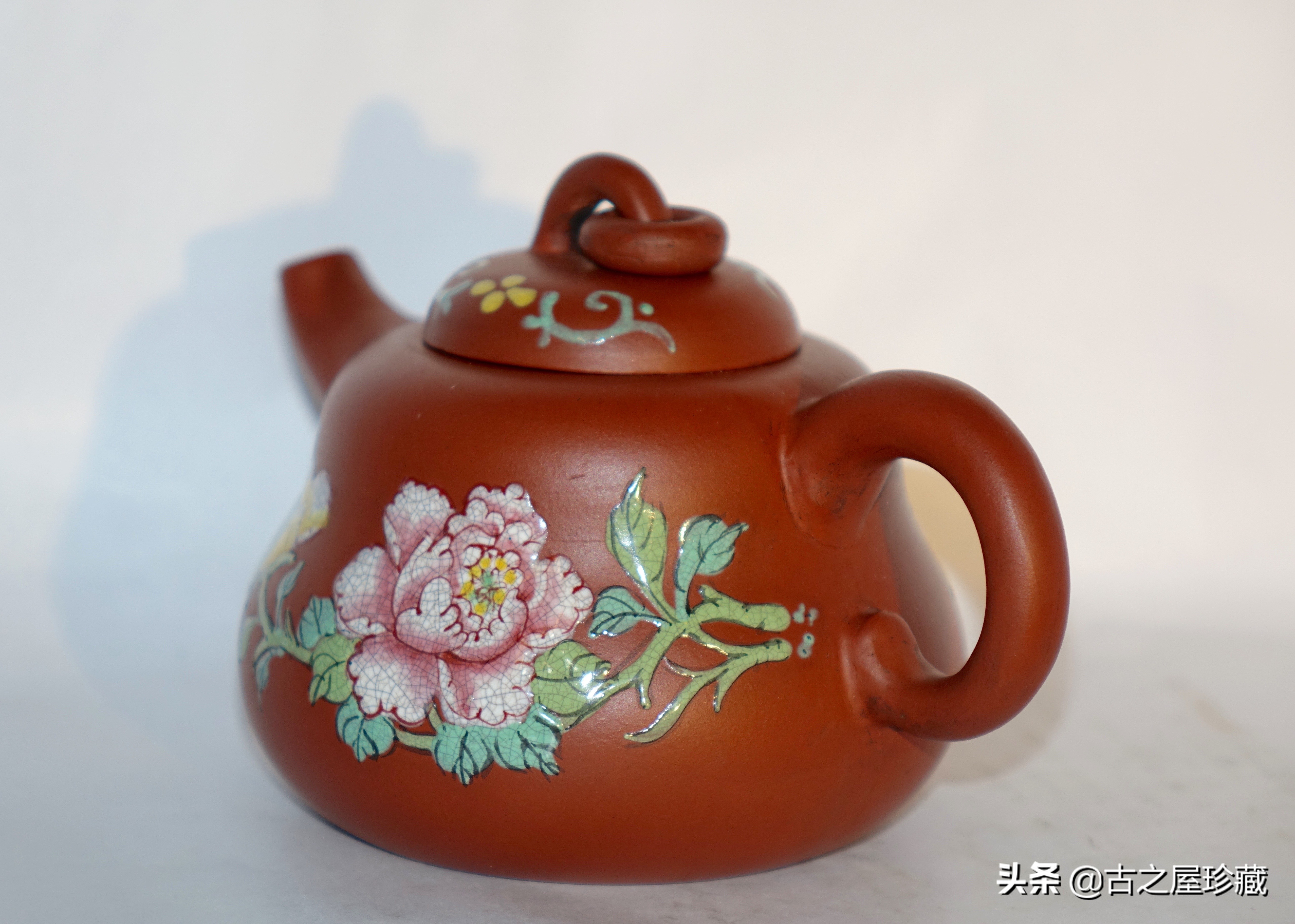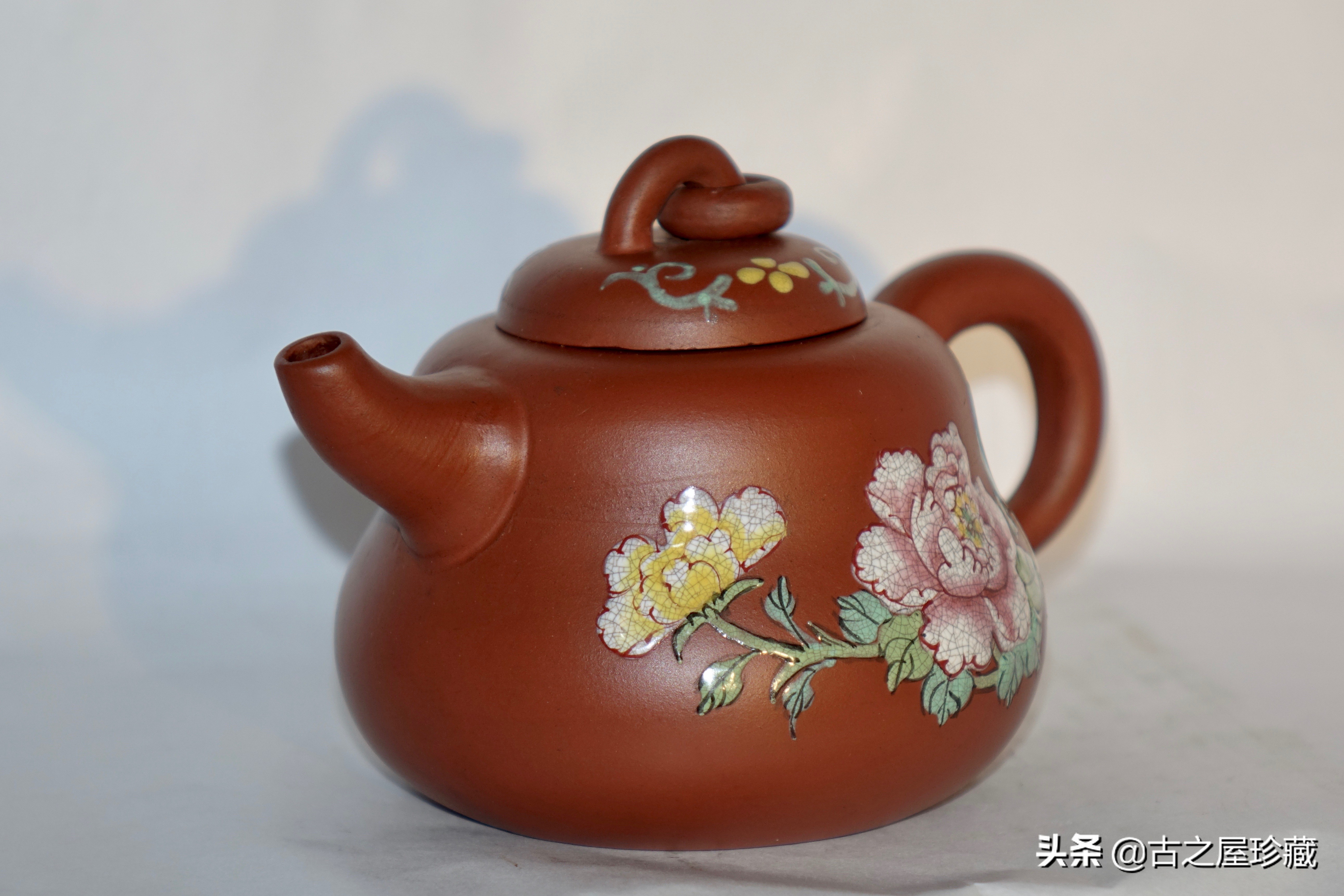 此壶制作难度极大,浑然天成,彰显大师风范,颇有古色古香之感,把形、质、神发挥得淋漓尽致。最妙是壶身上采用了珐琅彩的艳丽配以紫砂的素雅,正好衬托了出顾老的东方特色。正如大家赞赏顾老:“他的艺术,实在已是紫砂的至高境界。”