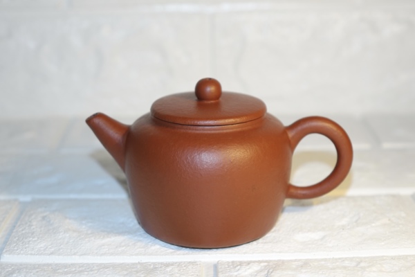 這類泥料是市場上最主流的朱泥,也是絕大多數壺友喜歡的泥料。表層是非常漂亮的水波皺紋,壺內壁也稍微帶點皺紋。全手工的特徵明顯。可泥片非常嚴實,拿它泡茶使用,無論多長時間後,壺蓋和壺口摩擦的聲音都不會變沙啞,始終都是那麼的清脆悅耳,可見這類朱泥壺的透氣性跟上面兩把壺相比就差很遠了。這類朱泥壺現在市場上的價格只有上面那把新朱泥壺的價格的20%左右而已。