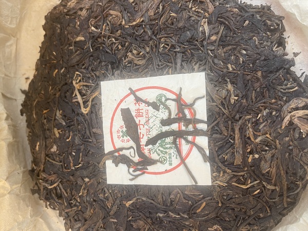 • 乾茶與條索:餅麵條索粗壯肥碩,烏褐油亮,芽頭顯毫,部分已轉為金黃色,這是多年干倉陳化的自然結果。壓制鬆緊適度,茶餅周正,展現大廠風範。