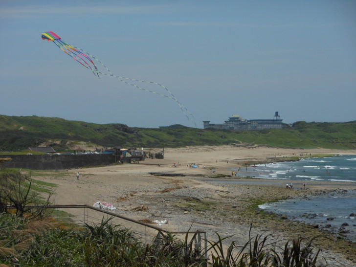在海邊的風箏公園有不少人在戲水、放風箏。