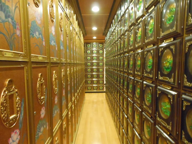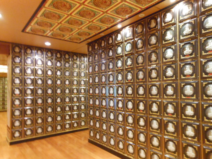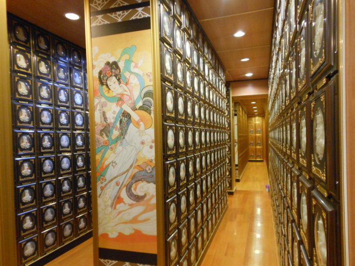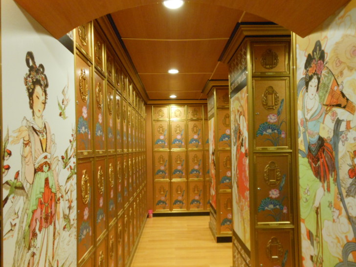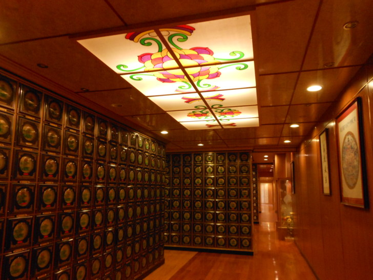 進入塔位區需脫鞋,塔問區採用溫暖的木質地板,搭配整體較深色木質顏色的屋頂與牆面色調,再以柔和暖色系的燈光打在羅列整齊的塔位面板上,顯得非常的溫馨高雅,明亮整潔。