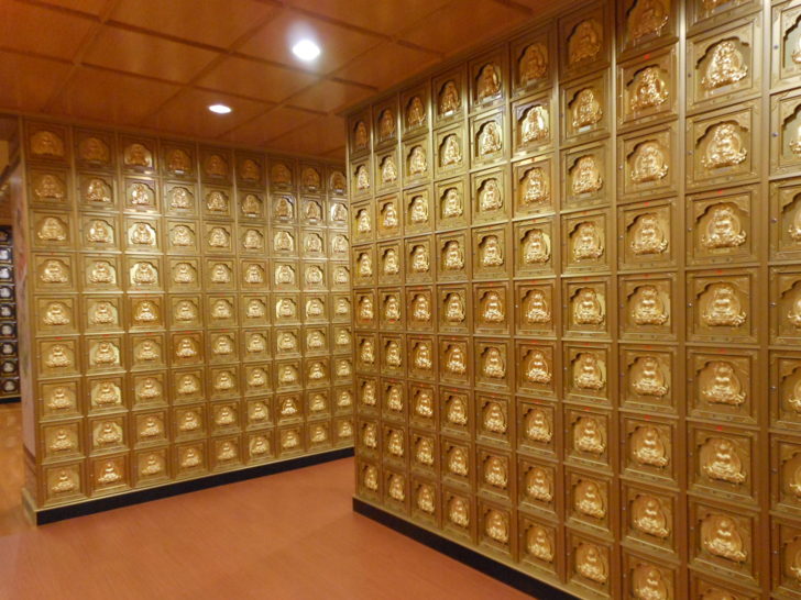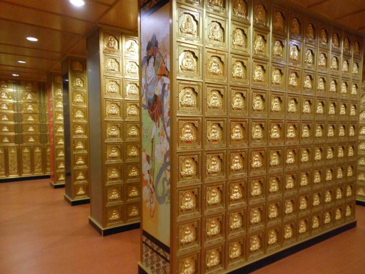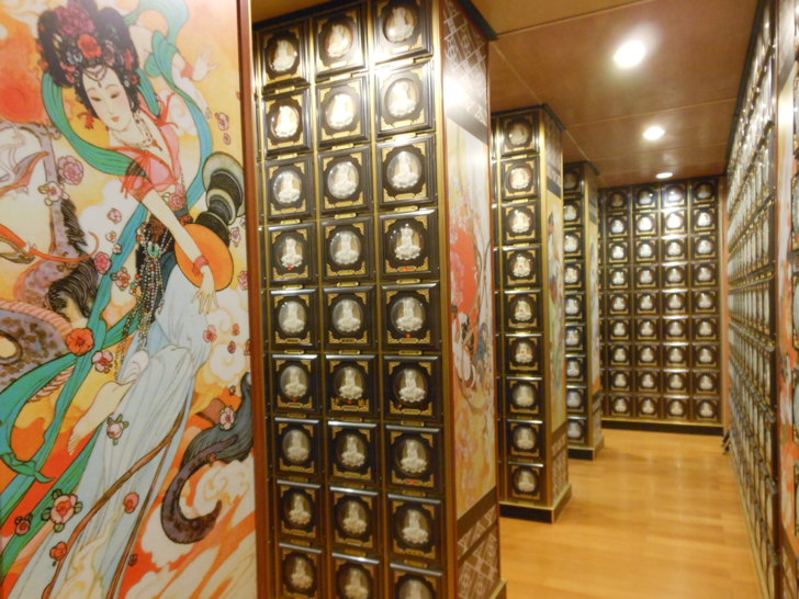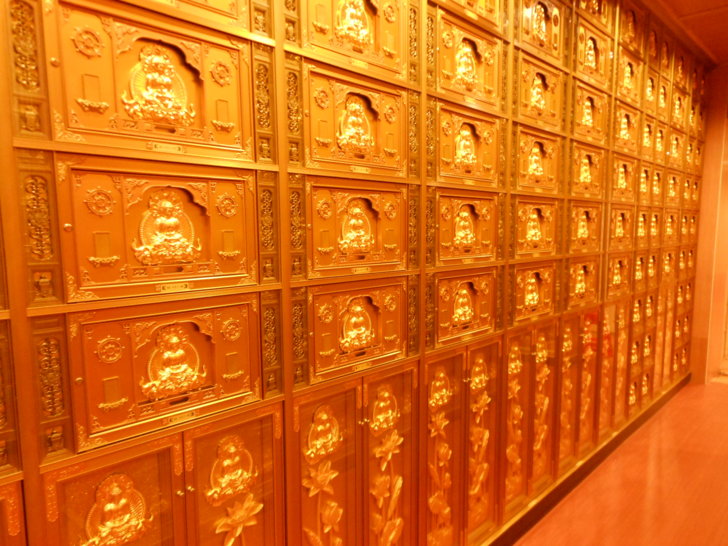 由樓梯向下走,來到牌位區的大殿。牌位區大殿也很寬,中央供奉三尊佛祖是西方三聖,四周設有往生者牌位,供往生者的親友參拜。