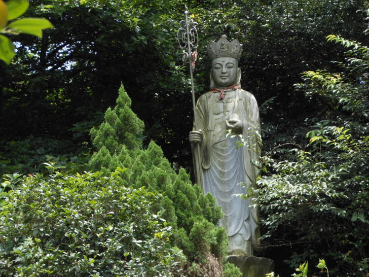 出了廟門後,到廟外庭園走走,發現假山上有尊地藏王菩薩,遠望過去宛如現身於山林草木間,也是生趣盎然。