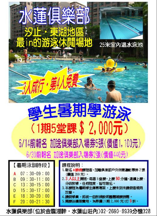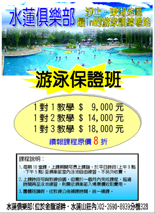 水蓮俱樂部-暑期游泳保證班1對1只要9,000元