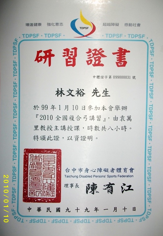 今天特別跟阿丹及阿勇教練一行三人,千里迢迢南下回去我的故鄉~台中,參加由〝台中市身心障礙者體育會〞主辦的『2010全國複合弓講習』,課程由國內知名國家級教練