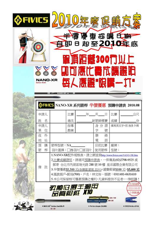自即日起至2010年12月止,凡是持有〝賽場成績證明及功夫射箭隊成員〞,均可以半價優惠方式,購買NANO-XR系列箭桿,每人限購一打。